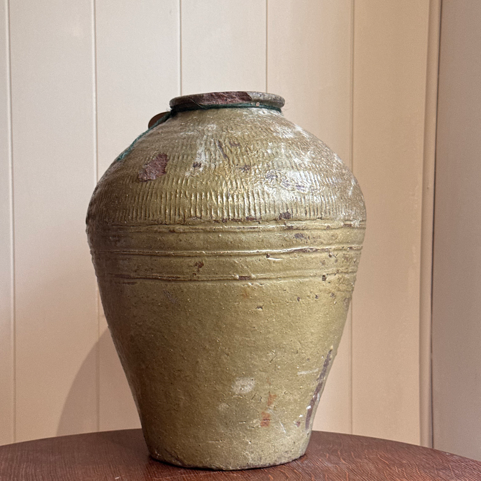 A beautiful antique Asian storage jar with a soft olive-toned glaze and hand-finished detailing. The rounded shape and narrow neck are typical of traditional jars once used for storing oil, water, or preserved foods.